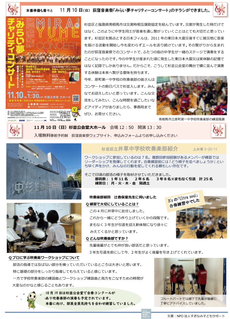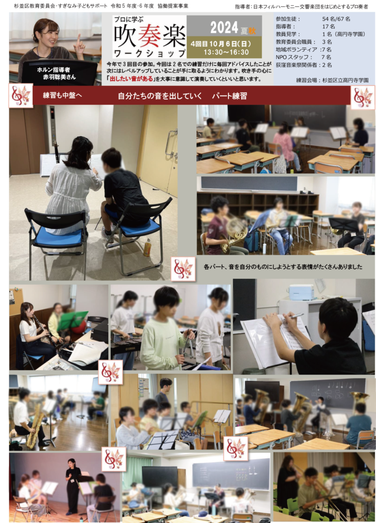 公開日: 2025.02.23 最終更新日: 2025.02.23 活動実績 プロに学ぶ吹奏楽 ワークショップ夏秋 4回目報告 開催日時: 2024年 10月6日 レポート1ページ目の詳細はこちらをクリック! レポート2ページ目の詳細はこちらをクリック! ワークショップ吹奏楽