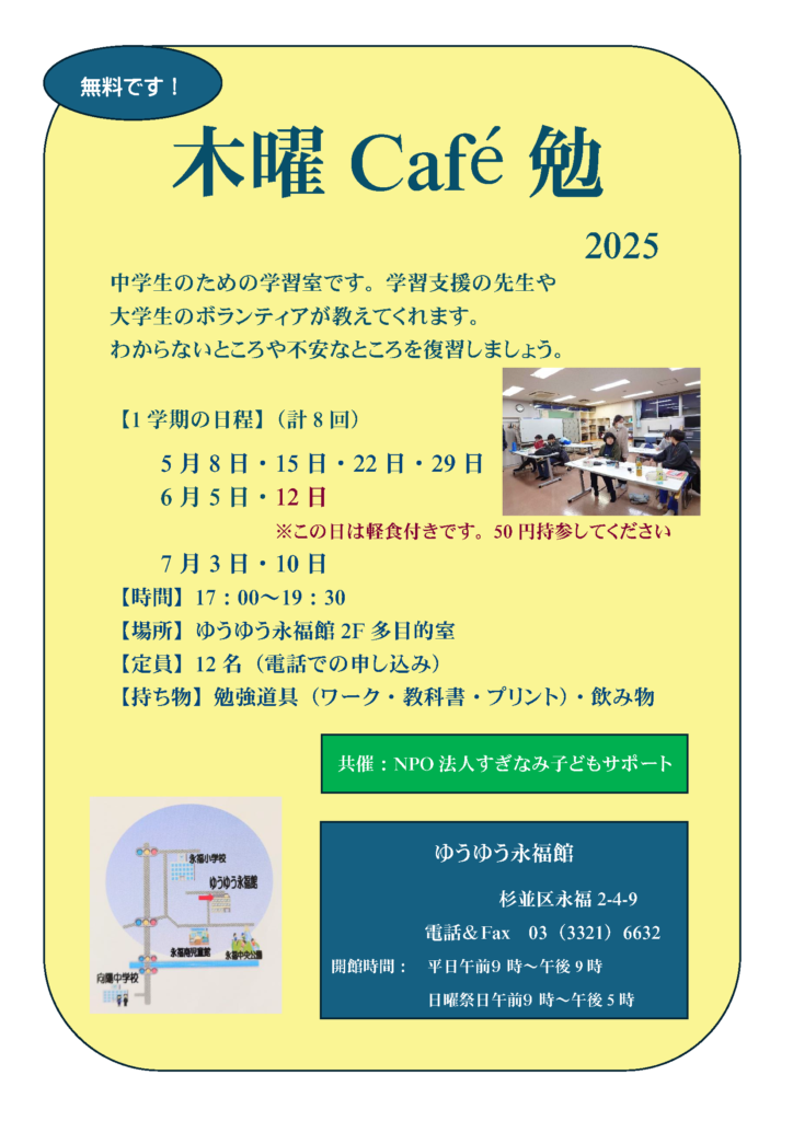 公開日: 2025.04.09 最終更新日: 2025.07.21 開催情報 【終了】木曜カフェ勉 5〜7月の予定 参加費: 無料 対象: 中学生 中学生のための学習室です。電話予約制。 場所:ゆうゆう永福館 ゆうゆう永福館参加者募集木曜カフェ勉